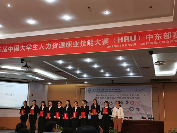 2019年10月17日至2019年10月20日经济管理学院参加第五届中国大学生人力资源职业技能大赛(HRU)中东部赛区比赛,取得一个团体三等奖,两个单项二等奖,两个单项三等奖的优异成绩。