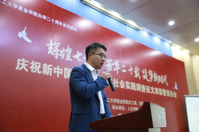 随后,由获得“庆祝新中国成立70周年”调查报告优秀征文一等奖的三个团队代表作成果报告。人文学院的顾袆青同学代表团队进行了题为《金陵“茶村“的茶故事——南京市黄龙岘美丽乡村的志愿服务与调研实践》的汇报演讲;人文学院的徐嘉甜同学代表团队汇报了《暖巢——新中国成立70周年背景下养老情况调查报告》;电光学院的俞程雯同学报告的主题是《建德市下涯镇丰和村建设美丽特色乡村的调查与思考》,她们和与会的师生分享了参加本次调研实践活动的过程、实践成果和体会。
