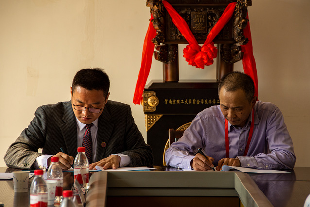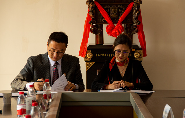 随后,马跃勇和江苏南洋文理研修学院院长陈阳共同为纪念鼎揭幕。