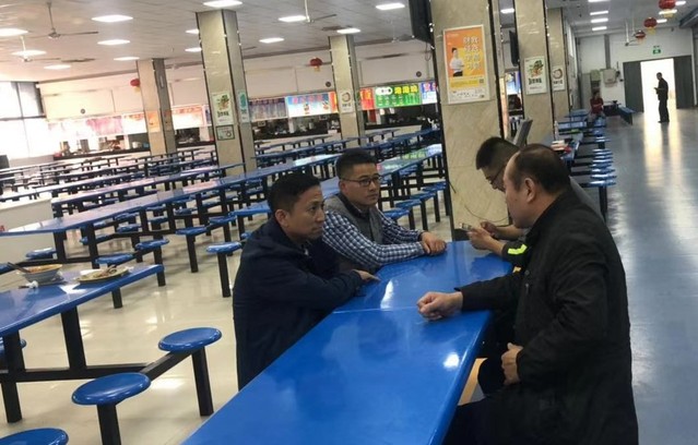 走访调研过程中,于洋等一行先认真查看了各食堂的后场加工区,重点检查了食品原材料储存区,详细对米、面、油、蛋、冻肉、调味品的检验报告进行了检查,并对后场加工区的环境卫生、消防安全等提出了针对性的指导意见。接着,又逐一跟各食堂负责人进行了详细的沟通,重点问询了食堂的经营收入、成本组成、能源消耗、原材料价格等方面的数据;针对近期原材料价格上涨较快的问题,认真听取了食堂负责人的相关汇报,并向食堂负责人征询好的建议。