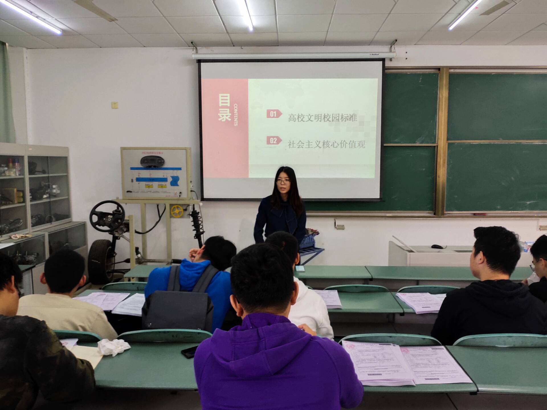 会议中期,辅导员将社会主义核心价值观分成三部分1.“富强、民主、文明、和谐”2.“自由、平等、公正、法治”3.“爱国、敬业、诚信、友善”,更加深入解释了社会主义核心价值观的内容及意义,从而增强了同学们对校园文明建设的必要性的认同感。