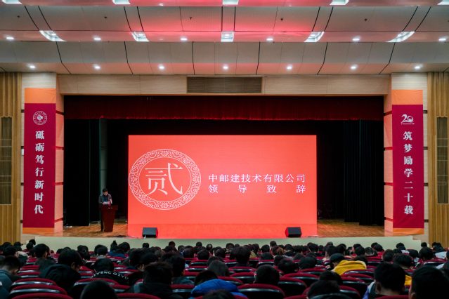 11月29日下午,我校和中邮建技术有限公司共建星空彩票苹果app基地和星空彩票苹果app专项基金合作揭牌仪式在大报告厅隆重举行。中邮建技术有限公司副总经理朱伟,江苏电信网络优化中心副主任张志华,中邮建技术有限公司人力资源部主任王小飞,我校副校长陈仁平,校长助理余志科以及党政办、教务处、资产处、科产处、电光学院等单位(部门)负责人和近800名师生代表出席该仪式。仪式由电光学院党总支书记马维主持。