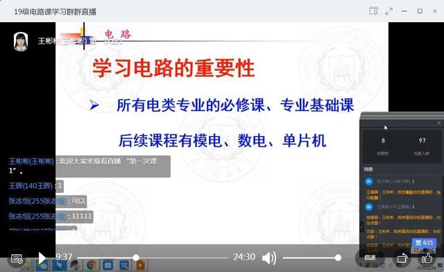 电光学院电路课程是一门非常重要的专业基础课,学好电路课程可以为后面的专业基础课和专业打下坚实的基础。王彬彬老师为了把一次线上课程完成的更加有成效,教师教授的知识能顺利的传递、学生能有效的掌握,教学以MOOC平台和钉钉直播为主,两者互为补充;学生管理和师生交流以钉钉群和QQ群为主。充分发挥每个平台的优势,尽量让师生沟通更加高效、便捷。线上课程开始,首先让学生在大学生MOOC平台上学习,观看黄锦安教授讲课视频并完成相关课堂测试。由于此前担心mooc平台会卡,所以提前让学生在手机app上把视频下载下来。现据同学反映观看良好。同时教师负责在q群和钉钉群解答同学们的问题。接着回到钉钉直播,王彬彬老师补充讲一些内容和相关习题。提供一道题做为课堂练习,指定某位同学回答,拍照上传自己的解题过程。其他同学使用群投票功能选择正确的答案。直播结束,完成学习任务后,学生到QQ群里完成接龙,首堂线上课程顺利完成。