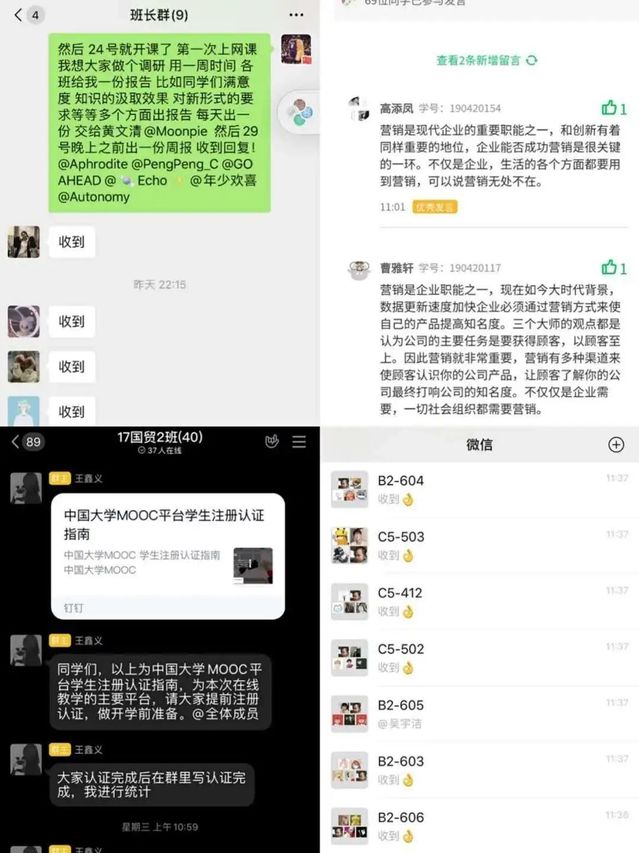 经济管理学院全体教职工认真准备,积极应对。为确保在线课程质量,全体教师精抓实干,集思广益,多管齐下;各专业分工合作,层层把关,做到教学处有指引,各年级有方案。针对线上教学,各门功课具备详细的教学计划和方案,针对性强,组织完善。面对疫情的考验,从关注学生身体状态到关注学生学习进度,经管学院全体师生毫不退缩,群策群力。一方面,辅导员每日在微信,钉钉等平台中了解学生的身体情况。微信里每个同学的一句“身体健康,无情况”是老师最大的放心。另一方面老师们也不畏困难主动学习,积极探索,借助慕课、微信、钉钉等软件进行网络教学。为保障线上教学顺利进行,课前学院教师检验课程文件,提前试播,确保音频视频能够正常播放。课程中教师按照教学计划,有序高效的进行了教学并与学生连麦互动,提问作答,确保了学生的上课状态和上课质量。课后教师在平台上布置作业,督促学生对课程内容进行回顾复习,对学生的学习成果进行了检测。各个环节环环相扣,保证了线上教学的质量和效果。打开线上教学平台,直播间里传来的是老师们熟悉的声音,安坐家中的学子默默紧跟视频内容,开展学习。课后的一句句“老师辛苦了”表达了同学们对老师的辛勤劳作的满满谢意。看着学生们的留言,老师们心里也暖暖的。