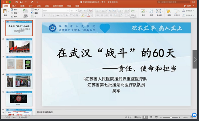 2020年6月22日上午10时,人文学院全体师生党员、积极分子和部分学生代表通过钉钉群在线直播分享的方式召开了“驰援武汉医护战士抗疫故事”分享会。本次分享会有幸邀请到江苏省人民医院副主任医师,第七批江苏省援鄂医疗队成员吴军医生为与会师生分享抗疫的感人事迹。
