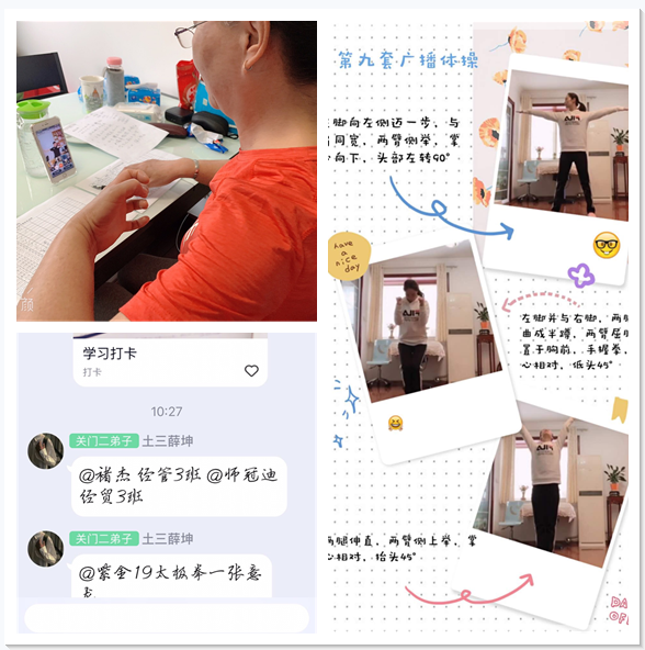 体育运动可以说是一种模仿的艺术,尤其是操类运动,模仿的作用更为重要。为了给同学们树立正确的动作示范,网络直播课之前,体育部全体教职工先行学习了第九套广播体操与八段锦,并分别进行了展示,纠正了不规范的动作。为了方便同学们课下自主练习,分别把刘沙菲老师演示的第九套广播体操与谢慧慧老师演示的八段锦视频上传到体育部网站并同时上传到各个教师负责的班级群,极大的便利了同学们自主学习的渠道。