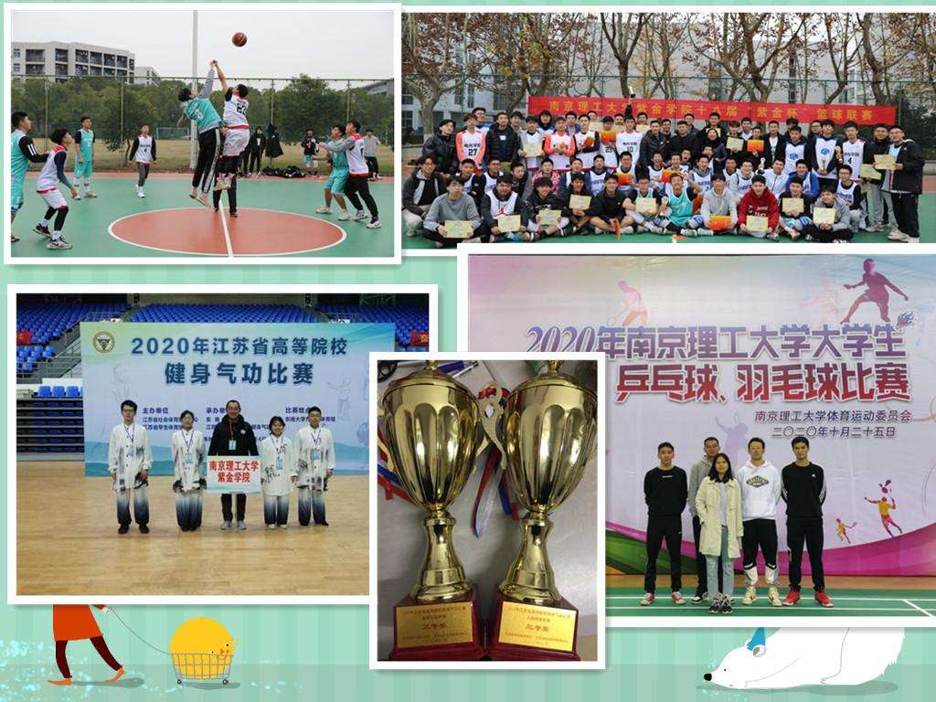 十月份,举办了星空彩票娱乐平台登录第十四届“紫金杯”足球赛,最终智能制造学院、商学院、电光学院分别获得冠、亚、季军;十一月份举办星空彩票娱乐平台登录第十八届“紫金杯”篮球赛,经3周的角逐最终18级智能制造学院、19级电光学院、17级电光学院分别获得冠、亚、季军;在“2020年南京理工大学大学生羽毛球比赛”,获得男单第五名、男双第五名的成绩;在“2020年江苏省高等院校健身气功比赛”,获得“易筋经”集体赛三等奖、“八段锦”集体赛三等奖。