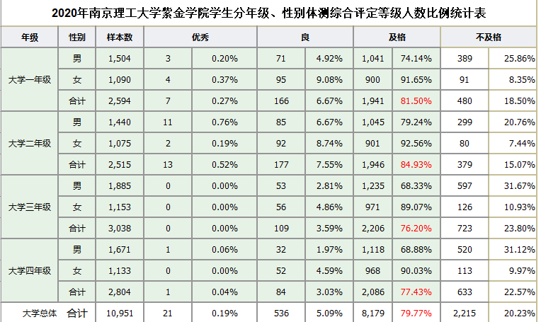 作为全国教育的大省、强省,为贯彻落实《高等学校体育工作基本标准》(教体艺﹝2014﹞4号)和《江苏省关于深化教育体制机制改革的实施意见》(苏办发﹝2018﹞27号)要求,进一步深化高等学校体育改革,改善大学生体育锻炼行为,促进大学生体质健康水平提升,省教育经研究,定于2019年起在南京地区普通高等学校(含独立学院)试点实施国家学生体质健康标准等级证书制度。随着这一制度的实施,大学生体质测试工作也被空前提升到新的高度。然而,由于疫情影响,上半年体测工作暂缓到下半年开展,从而翻倍了体育教师们的测试工作。体育部全体教职工放弃多次周末休息的时间,经过加班加点,顺利完成了4个年级共11383名学生测试工作,并在12月底完成了4个年级测试数据整理与分析并上报到国家学生体质测试网站。测试结果表明了疫情对我校大学生的体质状况产生了一定影响,与去年相比,今年的测试结果在优良率、合格率方面均有所下降,这也给体育部下一步的工作重点明确了目标与任务。