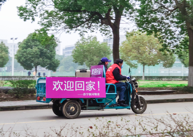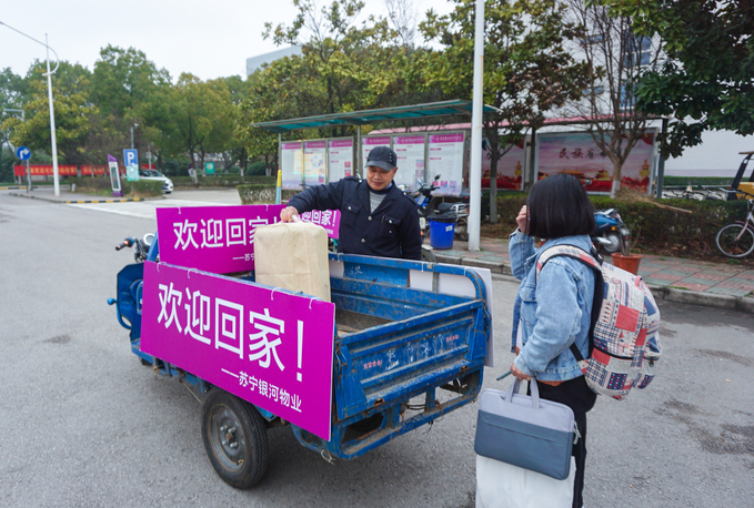 为帮助同学们搬运行李,物业人员早已准备好拖车和电动三轮车,“欢迎回家”的标语,让学生们倍感亲切,随处可见的电动三轮车,成为校园里一道亮丽的风景。
