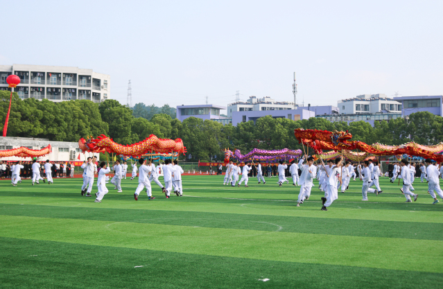 精彩绝伦的舞龙表演拉开了体育教学成果展示的序幕,十条锦龙在欢快的歌声下共同演绎了一场群龙欢舞,奔腾争跃的壮观场面。