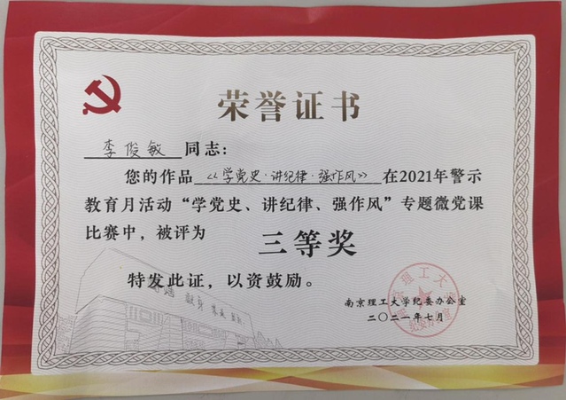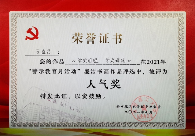 为了进一步提高党员、干部的廉政意识,增强廉洁自律的自觉性,加强党风廉政教育,南京理工大学纪委于2021年4月举办了 以“学党史,讲纪律,强作风”为主题的警示教育月活动,活动由廉洁教育书画作品展和微党课作品竞赛活动两部分组成。
