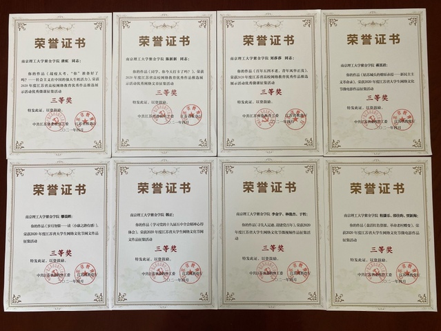 在江苏省委教育工委、省教育厅组织开展的2020年度高校网络教育优秀作品推选展示活动和江苏省大学生网络文化节中,我校精心组织,广泛动员,积极参与,成绩喜人,选送作品获得多个单项奖,学校荣获2020年度江苏省高校网络教育优秀作品推选展示活动优秀组织奖,是唯一获此荣誉的独立学院。