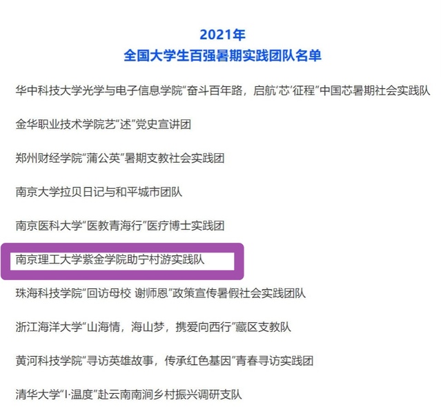 近日,中国青年报社联合全国千所高校开展的第七届寻找“全国大学生百强暑期实践团队”活动公布了全国最佳实践大学,全国最佳/优秀/百强暑期实践团队名单。此次百强暑期实践团队活动共评选最佳实践团队10个,优秀实践团队30个,百强实践团队60个。我校“助宁村游实践队”荣获2021全国大学生优秀实践团队。