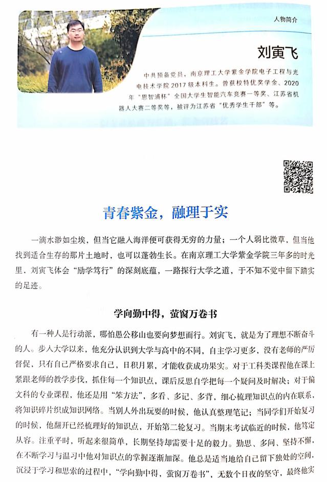 近日,《青春放歌:江苏省2020年江苏省国家奖学金获奖学生风采录》正式出版,书中收录了2020年全省78位国奖获得者的榜样故事,我校报送的2017级电气工程及其自动化专业刘寅飞同学的国奖事迹《青春紫金,融理于实》被收录其中。