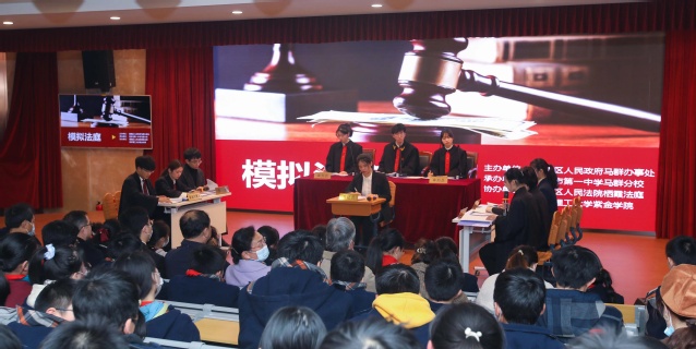 此次活动由人文学院法学专业负责人黄昕老师、法学专业教师张富霞老师带领的19、20级法学专业学生,通过角色扮演的方式向大家展示一场逼真的庭审场景。出席本次活动的还有马群办事处副主任宋冬生、马群司法所长朱宏伟、花岗派出所副所长盛杰、马群街道关工委副主任徐桂萍、栖霞区人民法院栖霞法庭副庭长林志栋、马群中学校长施工生以及马群中学的百余名师生。