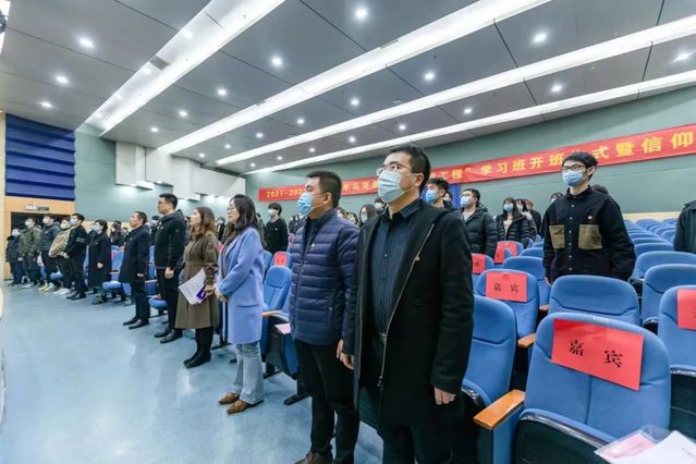 为深入学习领会习近平新时代中国特色社会主义思想,进一步提高我校青年大学生的政治思想素质,坚定跟党走中国特色社会主义道路的信念,增强服务意识,提高自身素质,进一步学习和贯彻党的十九届六中全会精神,12月15日,我校举行第一期“青年马克思主义者培养工程”学习班开班仪式暨信仰公开课。仪式由张雪飞老师进行主持。活动伊始,全体师生起立奏唱国歌。