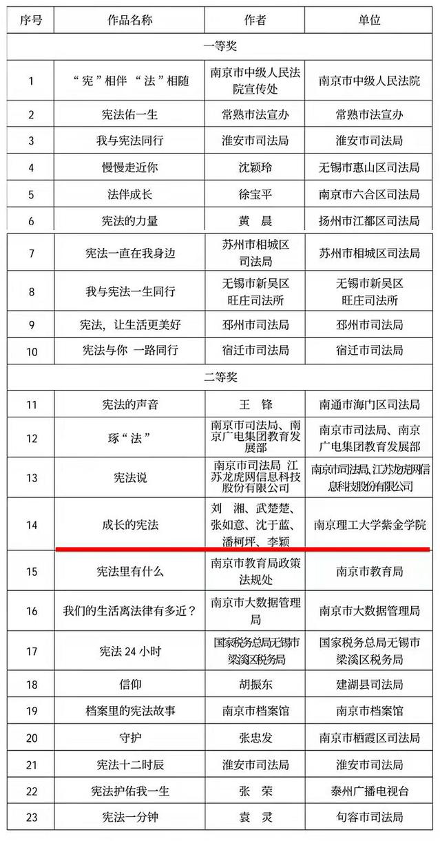 12月27日,由省委宣传部、省委网信办、省委省级机关工委、省司法厅、省文化和旅游厅、省法宣办联合在全省组织开展的主题为“歌颂党恩党情 弘扬宪法精神 共建法治江苏”为主题的宪法公益广告征集活动中,人文学院法律系和公共管理系选送的两只队伍荣获佳绩!由孙瑞瑞老师与陈冬老师共同带队指导的刘湘、武楚楚、张如意、沈于蓝、潘柯坪、李颖队的作品《成长的宪法》和潘柯坪、邵佳韵、董馨雯、刘湘队的作品《说唱宪法》经初审、专家评审、复审后分别获得全省二等奖和三等奖的好成绩!