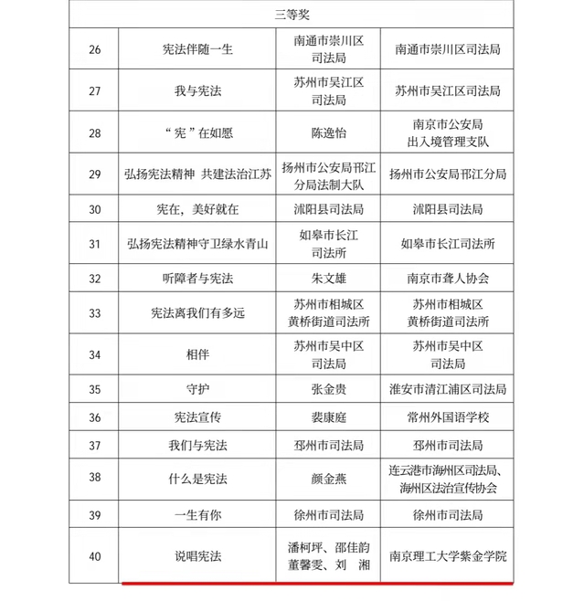 比赛形式由社会各界广泛参与、精心准备,如期择优向省法宣传办推荐报送。经初审、专家评审、复审等程序,坚持内容优先、质量第一的原则进行评比。此次比赛旨在深入贯彻落实习近平法治思想和中央、省委关于学习宣传宪法的总体部署,进一步完善优秀法治文化作品的激励支持政策,加大对法治文艺精品和法治文化基地的扶持力度,充分发挥法治文化精品力作在宪法学习宣传中的教育和熏陶作用,努力营造全社会尊重宪法、宪法至上、用宪法维护人民权益的良好社会氛围,切实为江苏扛起“争当表率、 争做示范、走在全列”光荣使命,奋力谱写“强富美高”新江苏现代化建设新篇章凝聚强大正能量。