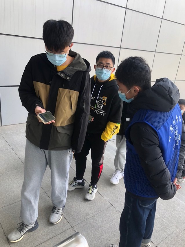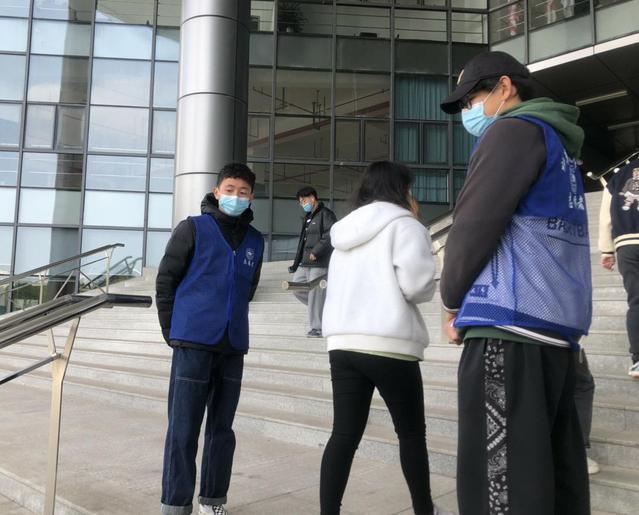 另一部分志愿者随时待命,等待抽调支援学校全员核酸检测工作,每天都有大批人员前来采样,尽管队伍很长,但在志愿者的辛苦指挥之下,核酸检测工作仍然井然有序。楼梯下,志愿者提前提示准备好苏康码和采样码;门口处,志愿者一一审核苏康码,方有资格进入采样;大厅里,志愿者们负责整队、指引,时刻提示要间隔1m距离。在他们的共同努力之下,核酸检测工作有条不紊的进行着……