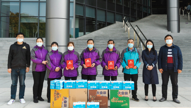 强劲、高行梅代表总务处和物业公司为物业工作人员送上牛奶等慰问品,苏宁银河物业公司还授予了马传海等11位优秀员工“抗疫先锋”荣誉称号。