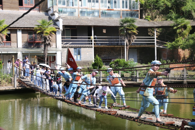 最后,全体党员在教官的带领下重走长征路,通过还原的场景,亲身感受瑞金门、长征第一桥、飞夺泸定桥、娄山关、大渡河、雪山、草地等长征历史过程,让大家切身感受这一部惊心动魄、气壮山河的英雄史诗,深刻感悟红军长征的革命精神。