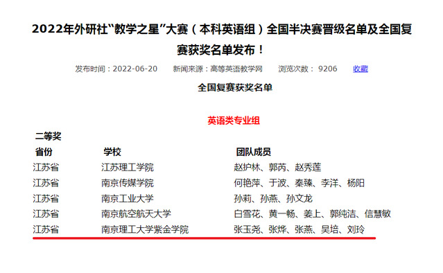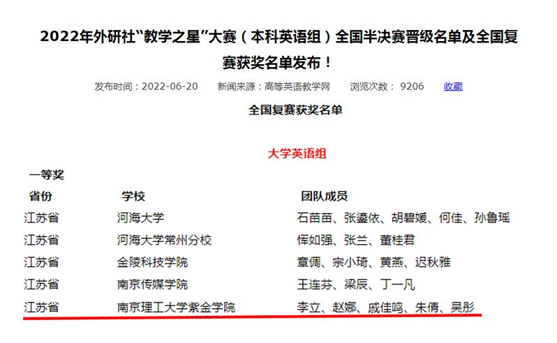 近日,由中国高等教育学会外语教学研究分会主办,外语教学与研究出版社承办的2022年外研社“教学之星”大赛(本科英语组)全国复赛获奖名单火热出炉!我校人文学院外语系选送的2支参赛团队表现优异,从全国各高校569支参赛团队中脱颖而出,双双获奖!由李立、赵娜、戚佳鸣、朱倩、吴彤5位教师组成的参赛团队荣获大学英语组全国复赛一等奖,由张玉尧、张烨、张燕、吴培、刘玲5位教师组成的参赛团队荣获英语专业组全国复赛二等奖。