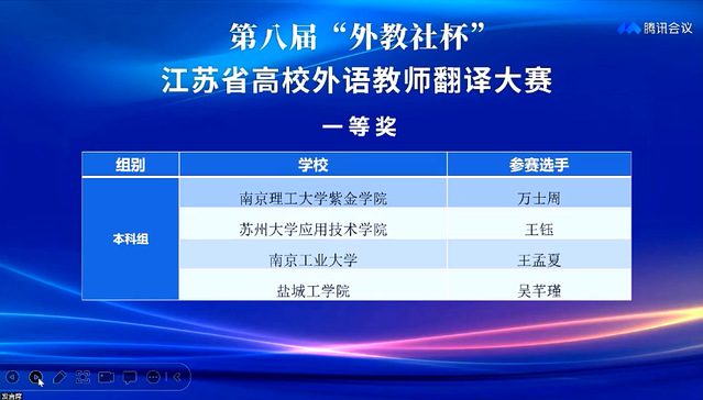 12月4日,第八届“外教社”杯江苏省高校外语教师翻译大赛在线上成功举办。由江苏各大高校选拔推荐的59名外语教师参加了本次比赛。我校人文学院外语系教师万士周、宗大卫代表学校参赛,经过激烈的角逐,最终分别以第一名和第六名的成绩分获本科组一等奖和二等奖。