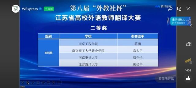 在12月4日下午进行的大赛颁奖环节,江苏省翻译协会会长刘成富等专家对大赛进行了点评。我校教师万士周代表本科组获奖选手发表了参赛感言。他在总结自己参赛得失的基础上,认为作为高校外语教师,在持续加强外语语言能力和教学能力的同时,应该大力提升自身的中国文化、文学修养,唯有如此才能担负起培养学生讲好中国故事和传播中国文化的重任。