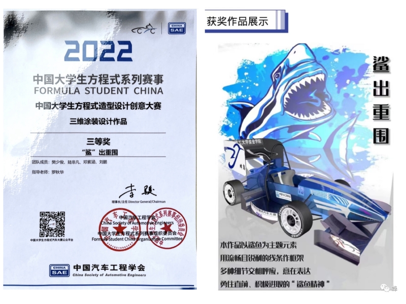 蜂鸟车队樊少俊,陆非凡,邓紫涵,刘鹏四位同学的参赛作品《鲨出重围》在车辆工程罗秋华老师的指导下,经过初赛和复赛的重重选拔,最终获得三维涂装设计全国三等奖的好成绩。