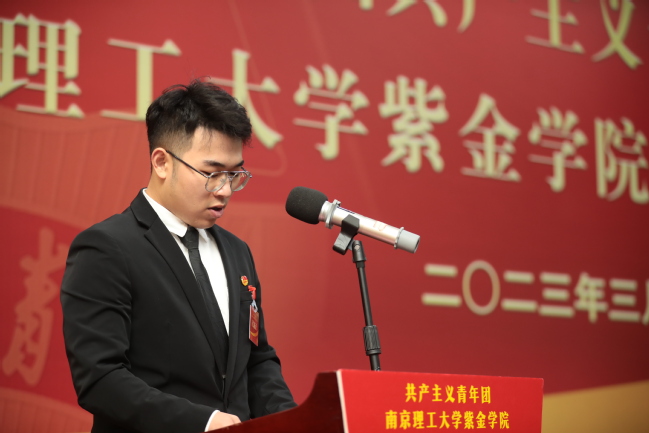 共青团星空彩票娱乐平台登录第三届委员会委员候选人姚思源宣读《共青团南京理工大会紫金学院第三次代表大会倡议书》,他倡议团员青年听党话、跟党走,在坚定理想信念的道路上砥砺前行,同时要沉下心、俯下身,在团结服务青年的一线中汲取力量,更要重实绩、出实效,在服务改革发展的大局中勇担使命,让青春在全面建设社会主义现代化强国的火热实践中绽放绚丽之花。