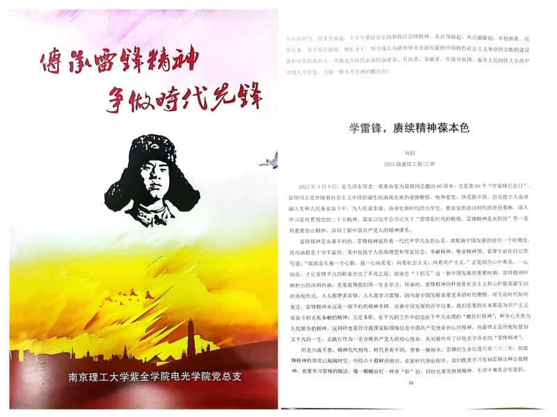 征文择优,汇编成册。为引领越来越多的同学追寻雷锋的脚步,支部开展了以“传承雷锋精神,做新时代的螺丝钉”为主题的征文活动。在本次征文活动中,总计收到投稿120件,我们从中遴选了18件稿件汇编成册,同学们通过作品体现了作为当代大学生对于“新时代雷锋精神”的深度理解,将自己的所见所思所想融入其中,提高了自我思想道德修养,积极弘扬了雷锋精神。面对壮阔的未来,我们无比坚信,在迈向民族复兴的伟大征程中,雷锋精神必将迸发出更加耀眼的光芒,激扬奋进新时代的磅礴力量!