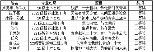 在学院党总支精心组织下,全体党课学员踊跃参与,经过预赛、复赛的选拔,最终9组参赛选手脱颖而出进入决赛。选手们同台竞技,畅谈青年学生的责任使命,抒发内心感受,现场亮点纷呈,选手们用极强的感染力,生动展现了智造青年学子认真学习贯彻党的二十大精神的精神风貌。经过现场激烈的角逐,本次演讲比赛共产生一等奖两名、二等奖三名、三等奖四名。获奖名单如下: