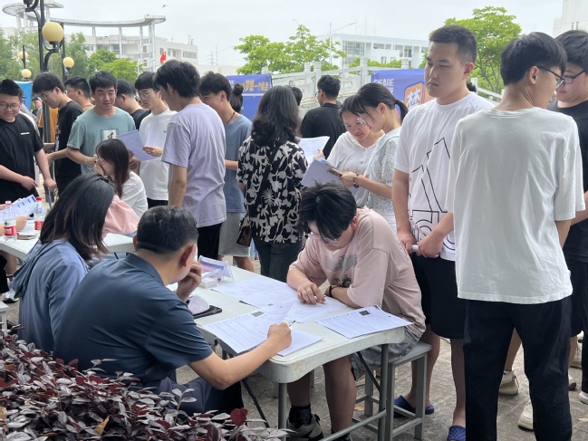 招聘现场十分热闹,同学们在企业展台前停留良久,一边听取工作介绍、一边向企业代表咨询问题。同学携带着自己的简历,不断地投递给不同的企业,在寻找最适合自己的岗位上不断努力。