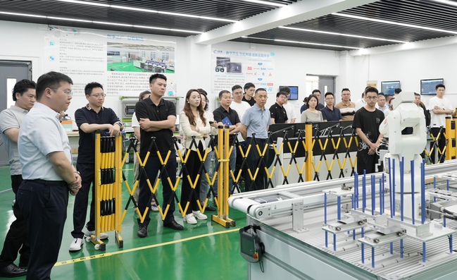 来访嘉宾在校训石旁合影留念后,参观了智能制造学院的工程实践平台和计算机与人工智能学院的苹果IOS实验室。实验室师生向来访嘉宾展示了全自动实验设备和学生创造设计作品,给嘉宾留下了深刻印象。