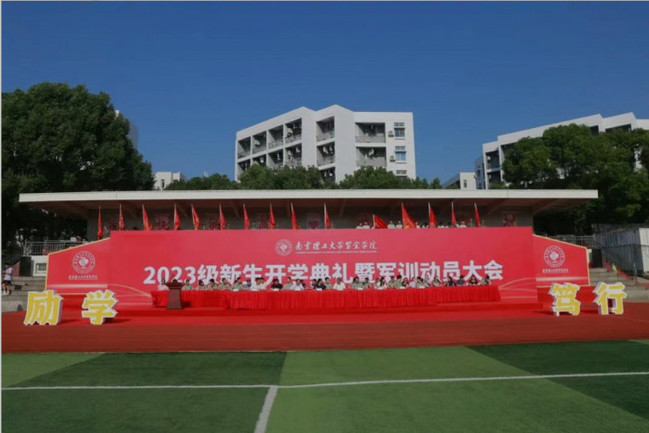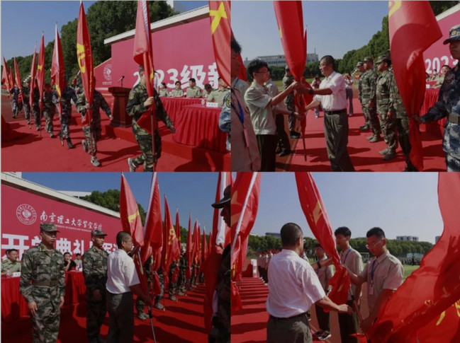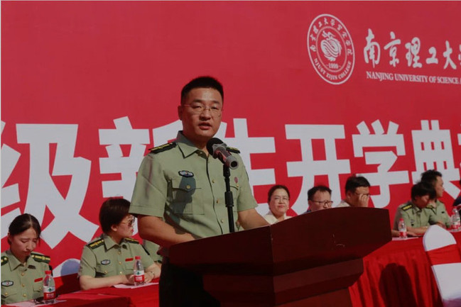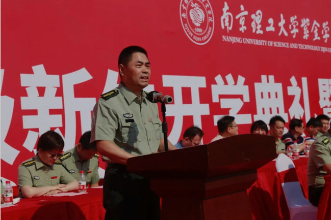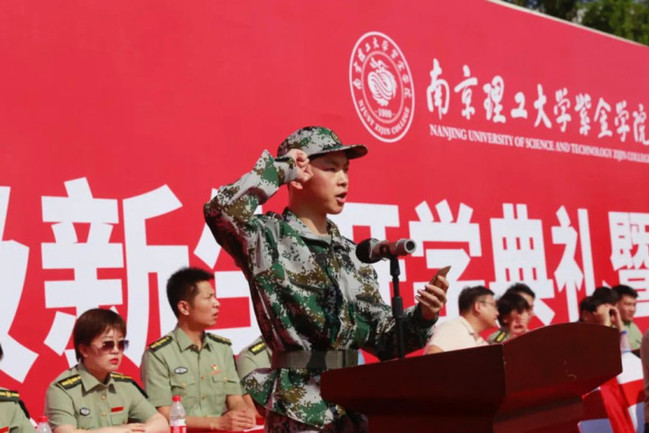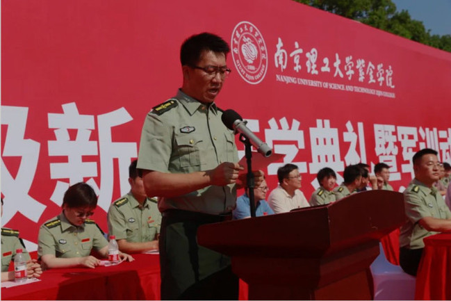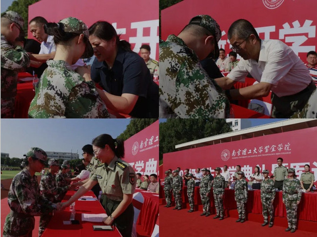 在慷慨激昂的音乐声中,校领导及军训团干部为新生代表佩戴南京理工大学紫金学院校徽。