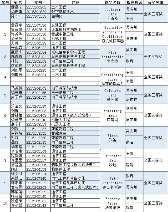 由中国大学生物理学术竞赛委员会主办、西南交通大学承办的第十四届中国大学生物理学术竞赛(作品赛)第二轮于2023年11月24日公示成绩,来自我校17个专业41名同学组成的十支队伍获得了全国三等奖,其中电光学院23人,智能制造学院11人,智能控制学院5人,计算机学院2人。