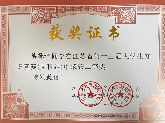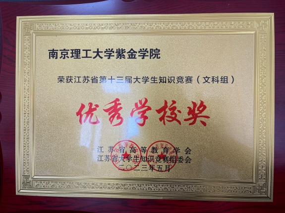 江苏省第十三届大学生知识竞赛(文科组)组织参赛人数973人,最终斩获省级二等奖1项、三等奖4项和优秀奖31项,我校获“优秀学校奖”称号。