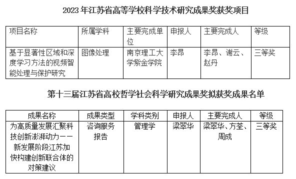近日,教育厅公布了2023年江苏省高等学校科学技术研究成果奖以及第十三届江苏省高校哲学社会科学研究成果奖评选结果,经高校推荐、形式审查、申报公示、专家遴选等多个环节,经专家评审,我校智能控制学院李昂副教授及其团队完成的项目《基于显著性区域和深度学习方法的视频智能处理与保护研究》荣获2023年江苏省高等学校科学技术研究成果奖三等奖;梁翠华高级经济师及其团队的《为高质量发展汇聚科技创新澎湃动力——新发展阶段江苏加快构建创新联合体的对策建议》荣获第十三届江苏省高校哲学社会科学研究成果奖三等奖,实现了我校在江苏省高校科学研究成果奖评选中的历史性突破,是我校有效落实有组织科研的重要成果。