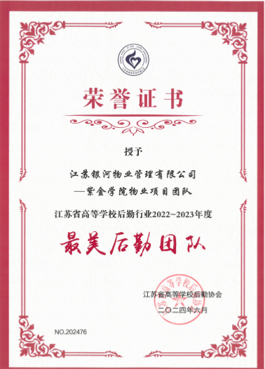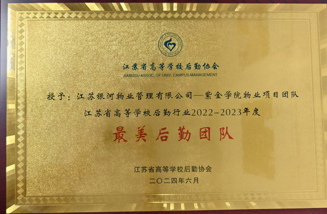 6月2日,江苏省高校后勤协会“2022-2023年度最美后勤人(团队)”发布会在苏州大学举行。我校后勤服务物业团队“江苏银河物业紫金学院项目团队”荣获江苏省高等学校后勤行业2022-2023年度“最美后勤团队”的荣誉称号,同时学校还被授予江苏省高校后勤“学生劳动教育基地”。