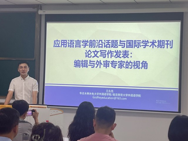 6月17日上午,华北水利水电大学外国语学院副教授、南京师范大学外国语学院硕士生导师王永亮博士,应我校人文学院邀请于实训楼420开展了一场题为“应用语言学前沿话题与国际学术期刊论文写作发表:编辑与外审专家的视角”的学术讲座。讲座由人文学院实验室主任张美婵副教授主持,人文学院副院长刘玲副教授、外培处副处长戚佳鸣副教授及外语系全体教师参会。