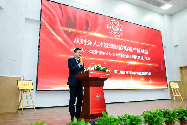 英国特许公认会计师公会(ACCA)上海代表处华中区教育关系经理毛坚发表了题为“从财会人才发展新趋势看产教融合”的演讲。毛坚先生强调了ACCA全球网络在培养财会人才中的作用,展示了ACCA如何通过企业参访、职业发展日、商赛等系列活动,为学员提供全方位的职业发展支持。他提到,ACCA与高校合作建立的实习基地及年度教育大会,为学生提供了宝贵的实习机会,提升了ACCA学员的核心竞争力。ACCA将与高校共同推动产教融合,培养适应社会未来需求的财会精英。