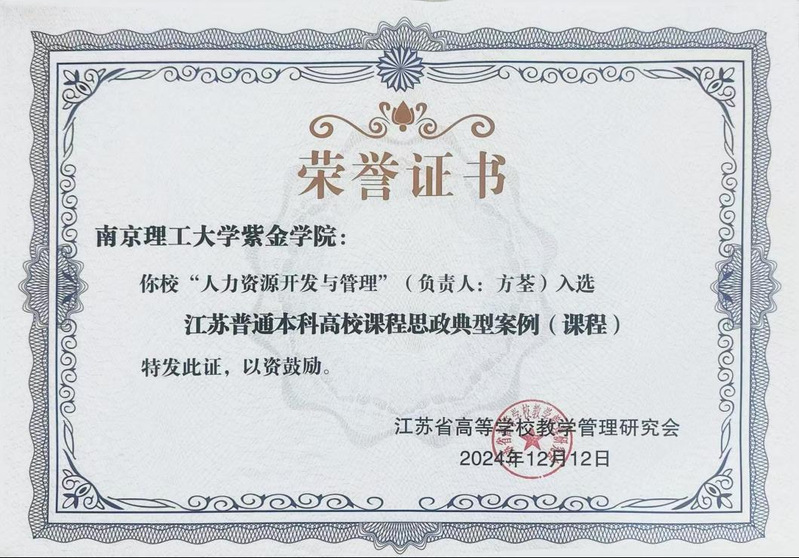 2024年12月11日至12日,江苏省高等学校教学管理研究会课程思政建设工作委员会2024年学术年会在南京召开。会上举行了2024年省课程思政专业和课程建设典型案例征集评选颁奖,我校《人力资源开发与管理》课程思政典型案例获得表彰。