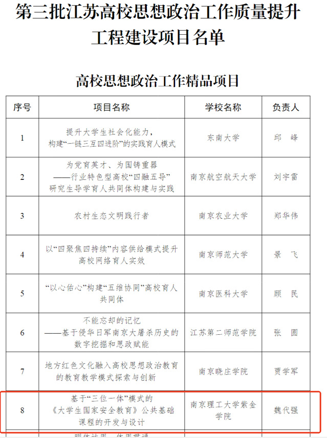 12月24日,江苏省教育厅公布了第三批江苏高校思想政治工作质量提升工程建设项目名单,马研部魏代强主任申报的《基于“三位一体”模式的〈大学生国家安全教育〉公共基础课程的开发与设计》项目获批高校思想政治工作精品项目。
