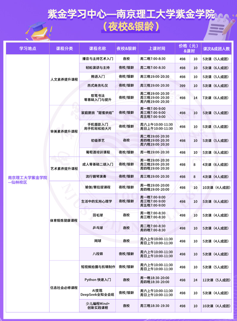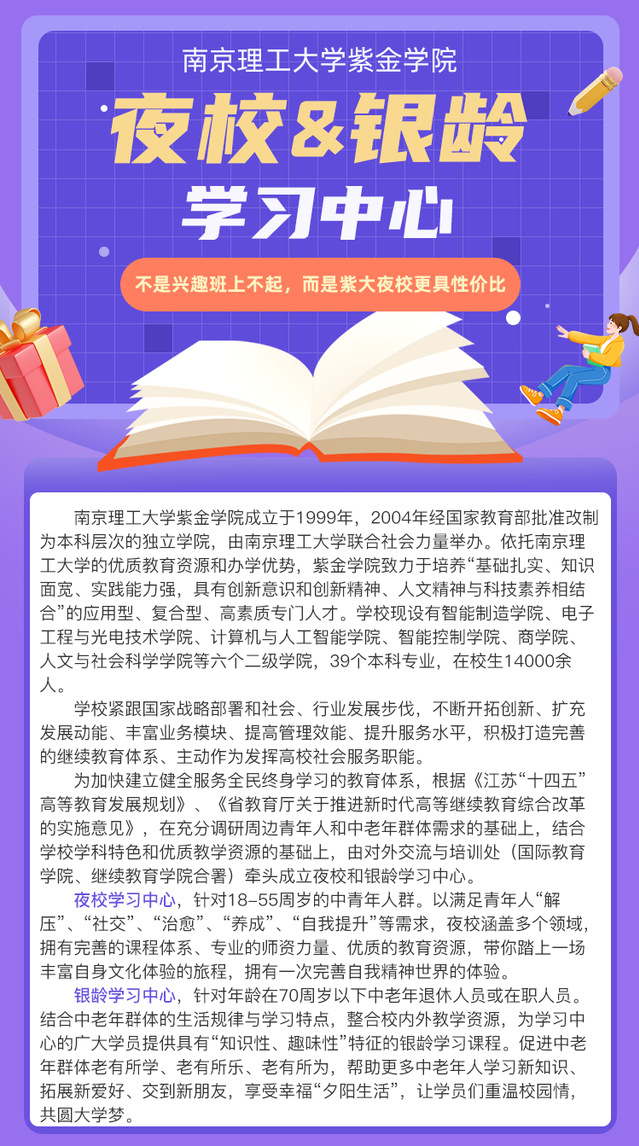 星空彩票娱乐平台登录倾力打造“紫金学习中心”,推出“青年夜校课程+银龄学堂”双轨制学习模式!这里不仅是知识的充电站,更是实现人生进阶的黄金跳板。无论你是渴望突破的在校学子、寻求第二曲线的职场精英,还是拥抱数字时代的活力银龄,都能在这里找到绽放自我的舞台!