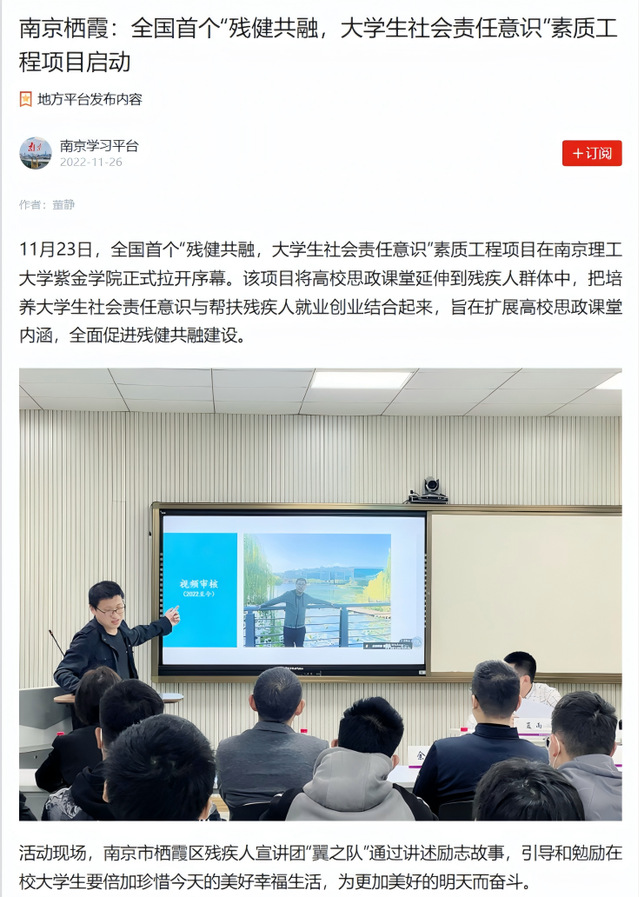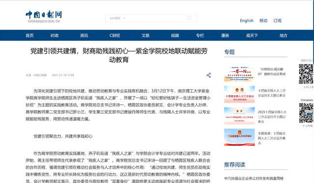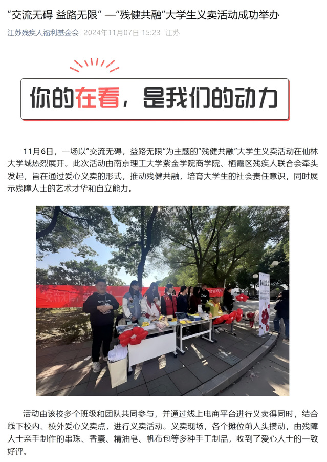 五载耕耘,硕果累累。商学院党总支与栖霞区残联的合作获学校推荐申报江苏省第二届高等学校劳动教育优秀实践项目,衍生出“栖栖爱心助残小程序”创新项目,相关事迹被中国日报网、学习强国南京学习平台、江苏残疾人福利基金会、栖霞区委宣传部等媒体及官微报道。