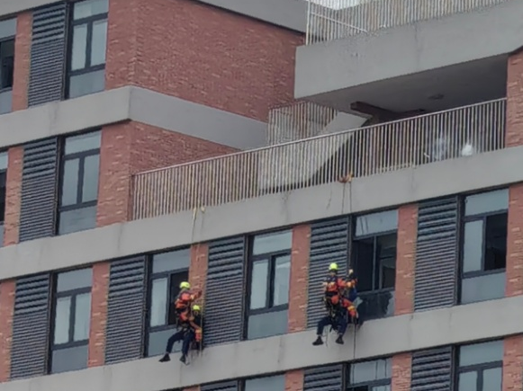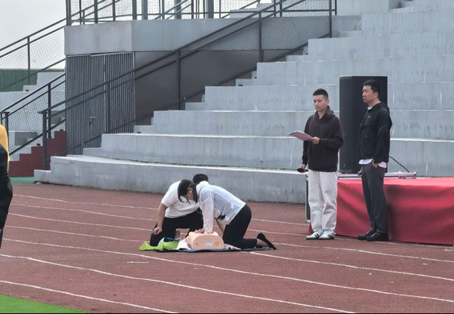 消防、医疗等专业救援力量迅速在疏散集结点处就位,按照指挥部统一部署开展精准救援。红十字会志愿者聚焦应急救护核心技能,现场演示心肺复苏操作流程和AED除颤仪的正确使用方法;医护人员针对模拟的跌倒骨折场景,直观展示外伤包扎的规范步骤,普及医疗处置常识。消防救援队伍则聚焦高层建筑救援难点,开展专业绳索救援演练,同时组织消防队员现场实施灭火作业,并邀请学生亲身体验灭火器操作,手把手指导学生掌握灭火器的“拔销、瞄准、喷射”等使用核心步骤。学生们纷纷表示在沉浸式演练中深化了安全认知、锤炼了应急技能,有效提升了自身安全防范、自救互救的意识。