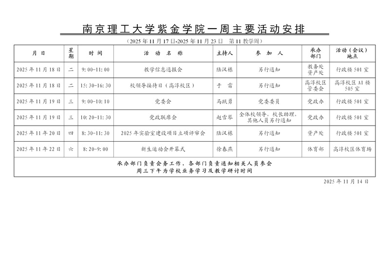 学校一周主要活动安排(第11教学周)