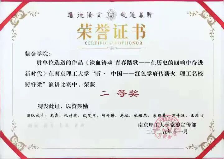 11月27日晚19时,南京理工大学“听·中国——红色学府传新火 理工名校铸脊梁”演讲比赛决赛在文艺馆隆重举行。由我校师生庞鑫、张靖奕、武笑寒、项子谦、马驭、张雅菡、朱雨晨、万峰延、王政文组成的代表队作为第二个登场的参赛队伍,凭借题为《铁血铸魂 青春踏歌——在历史的回响中奋进新时代》的精彩演讲,斩获比赛二等奖。
