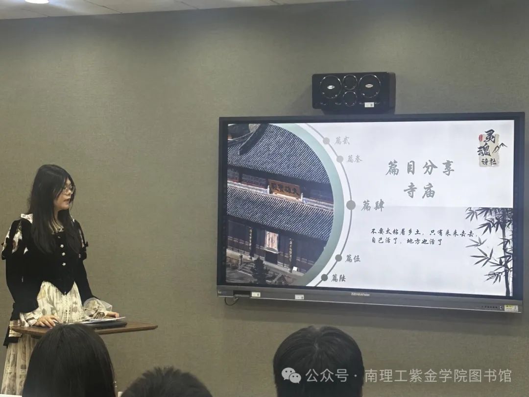深秋怡然,金桂馥郁,读书正当时。2024年10月23日读者协会于图书馆202视听室举办了《文化苦旅》读书分享会。分享会由灵魂诗社成员们主讲,吸引了近30名来自各个院系的同学积极参加。读者服务部主任任精举和读协指导老师刘婷婷参与了活动。
